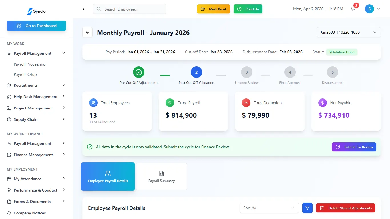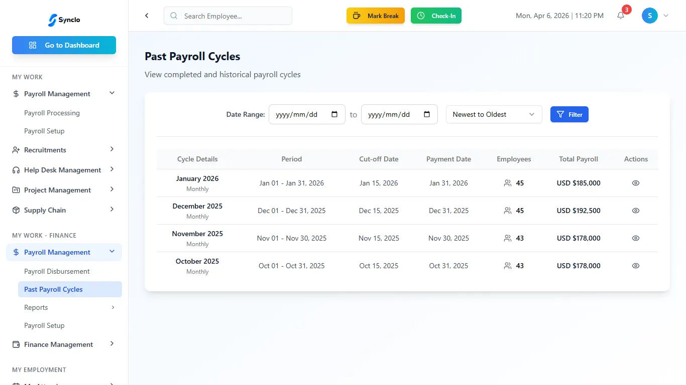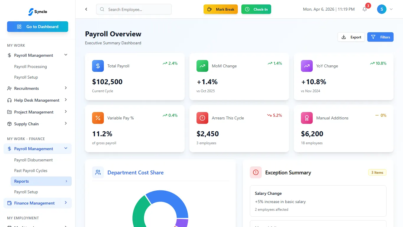 Synclo empowers HR and finance teams to manage payroll with precision through automated calculations, centralized data, and real-time insights that ensure accuracy, compliance, and operational efficiency. It brings clarity to complex payroll processes, allowing teams to operate with confidence and control at every step.