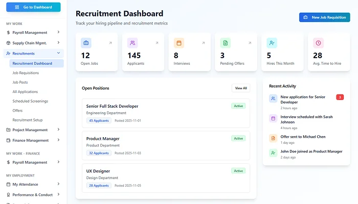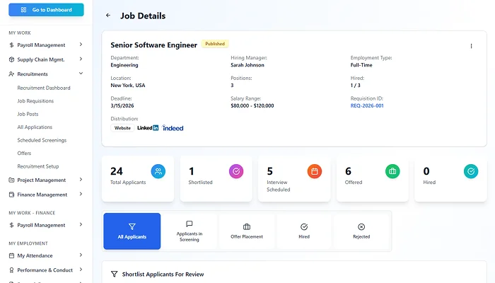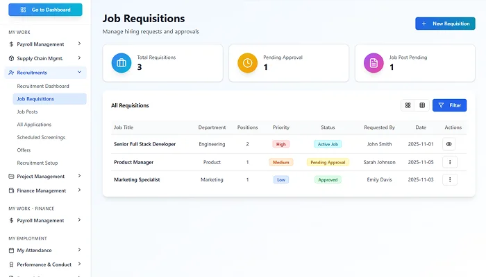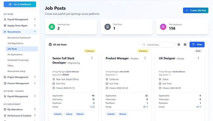 Create job openings with clear requirements, responsibilities, and approval flows, ensuring hiring starts with clarity.