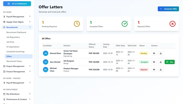 Route offers and hiring decisions through defined approval workflows, keeping recruitment compliant and controlled.